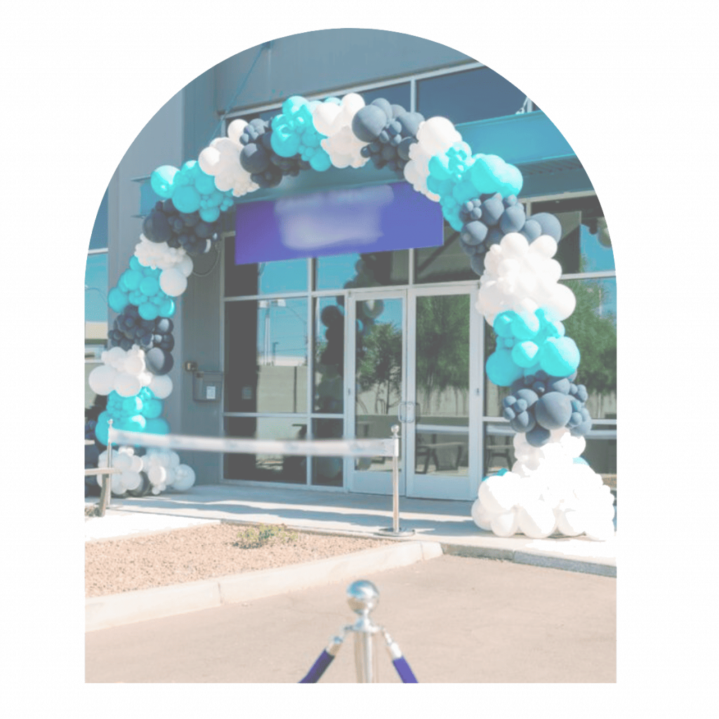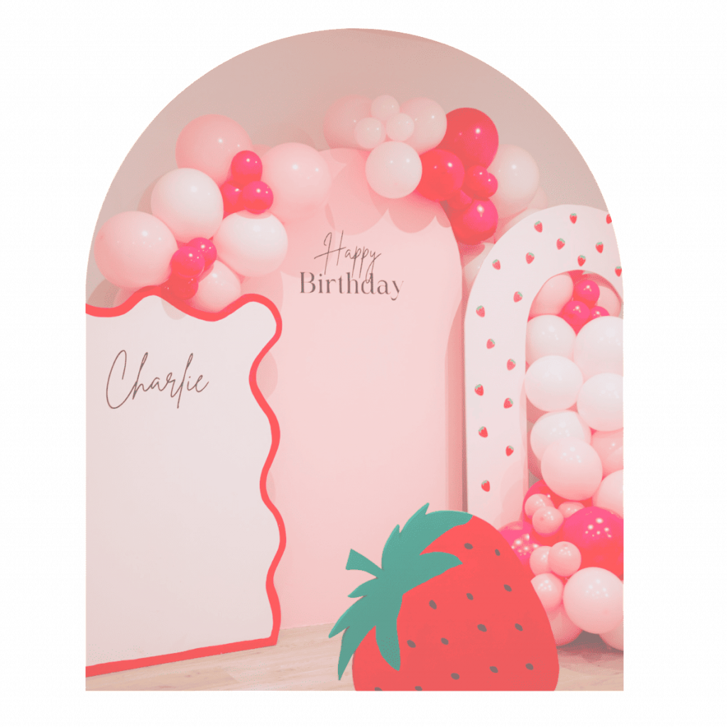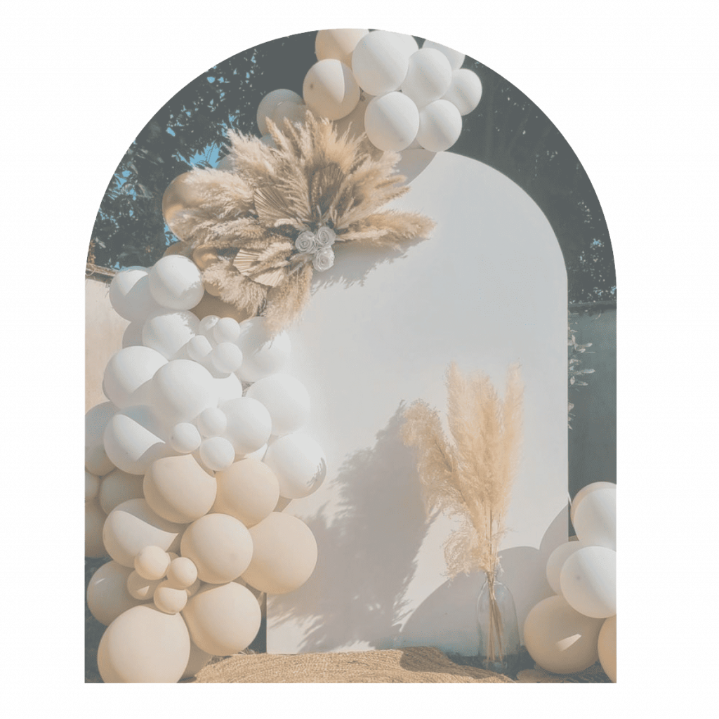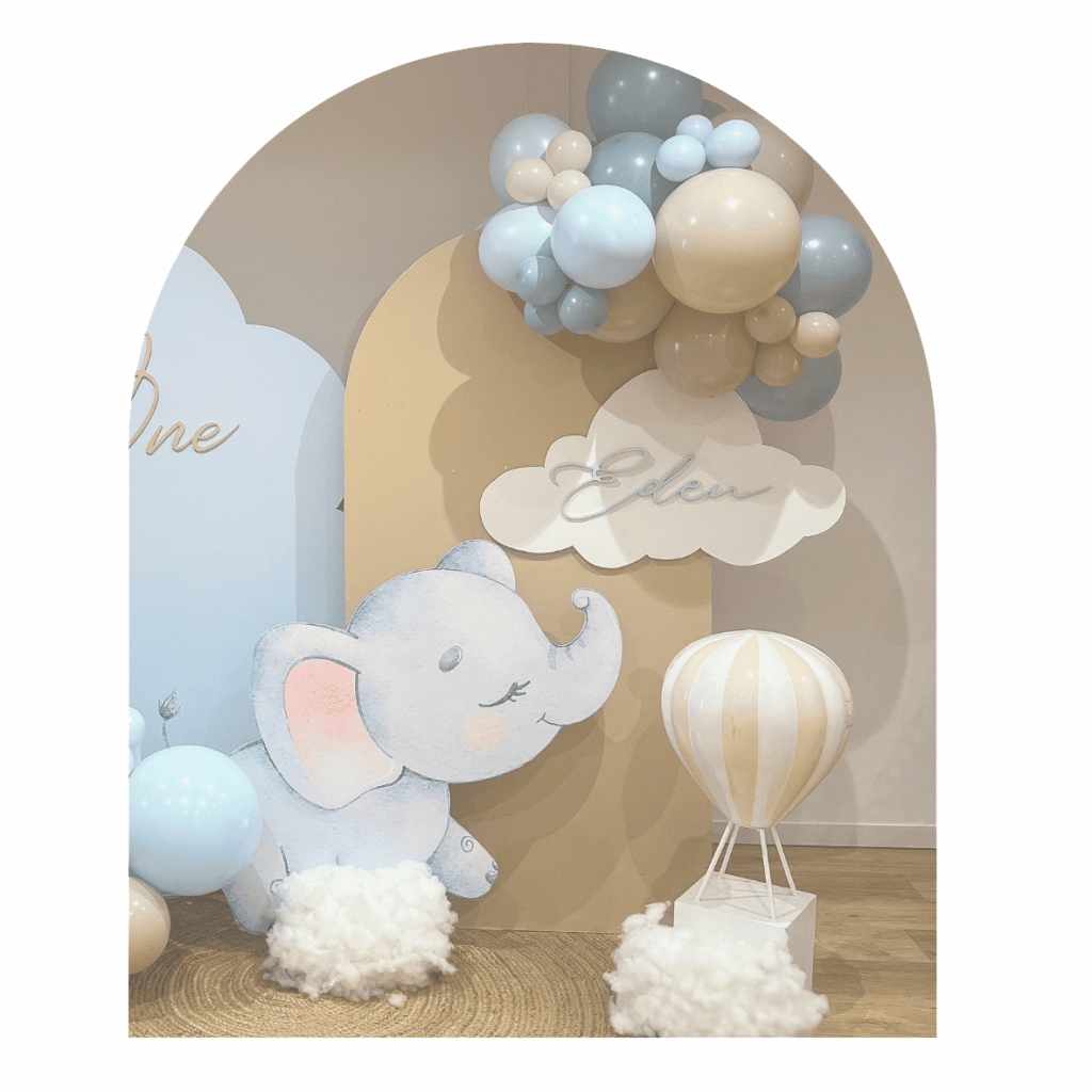 Décoration d’anniversaire sur-mesure avec arches de ballons, fleurs et scénographie personnalisée.