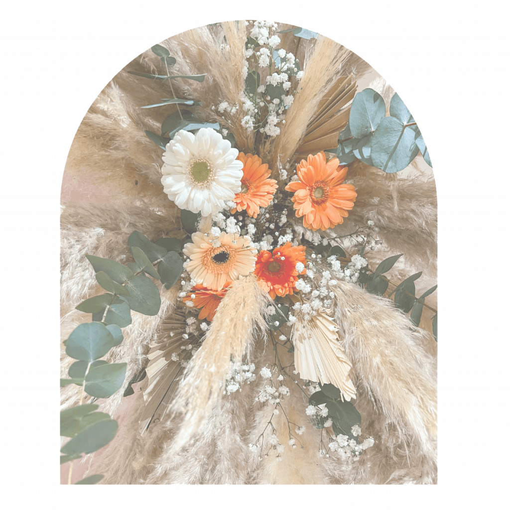 Décoration de baptême douce et poétique, avec couleurs tendres et compositions fleuries.